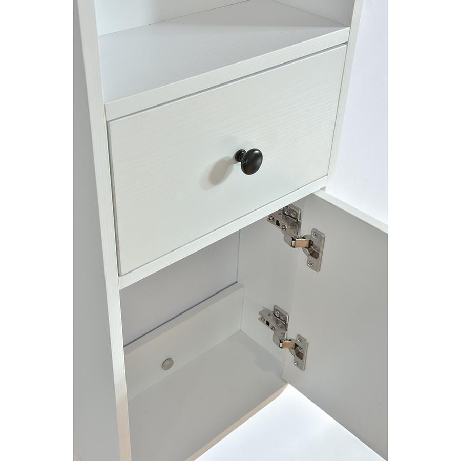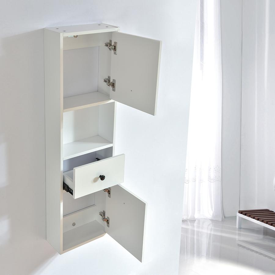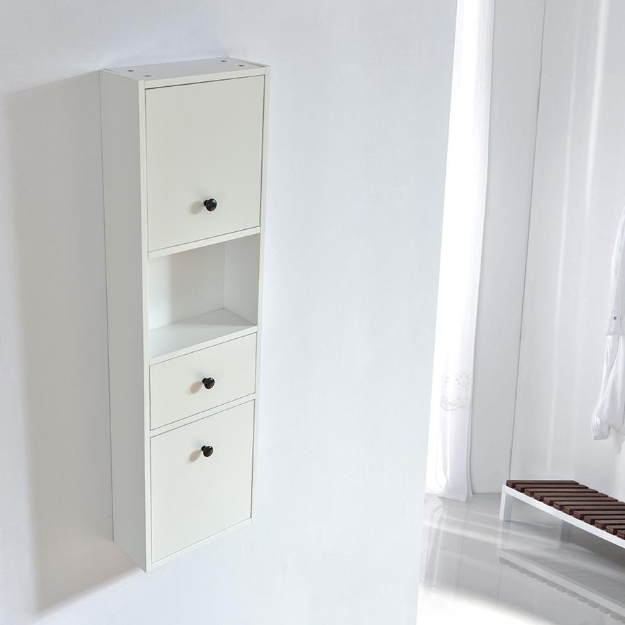 Questa colonna pensile di grandi dimensioni offre tre vani interni, grazie a due grandi ante e un cassetto, oltre a un comparto esterno.