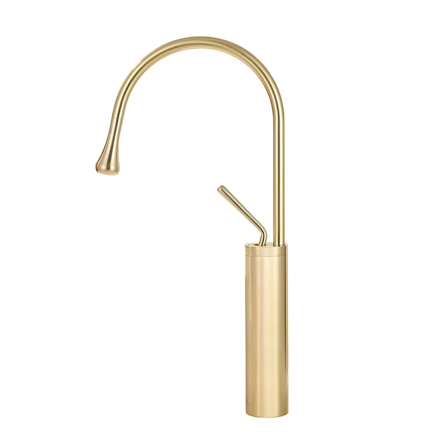 Rubinetto miscelatore rialzato per lavabo o lavabo da appoggio, finitura oro spazzolato e beccuccio girevole.